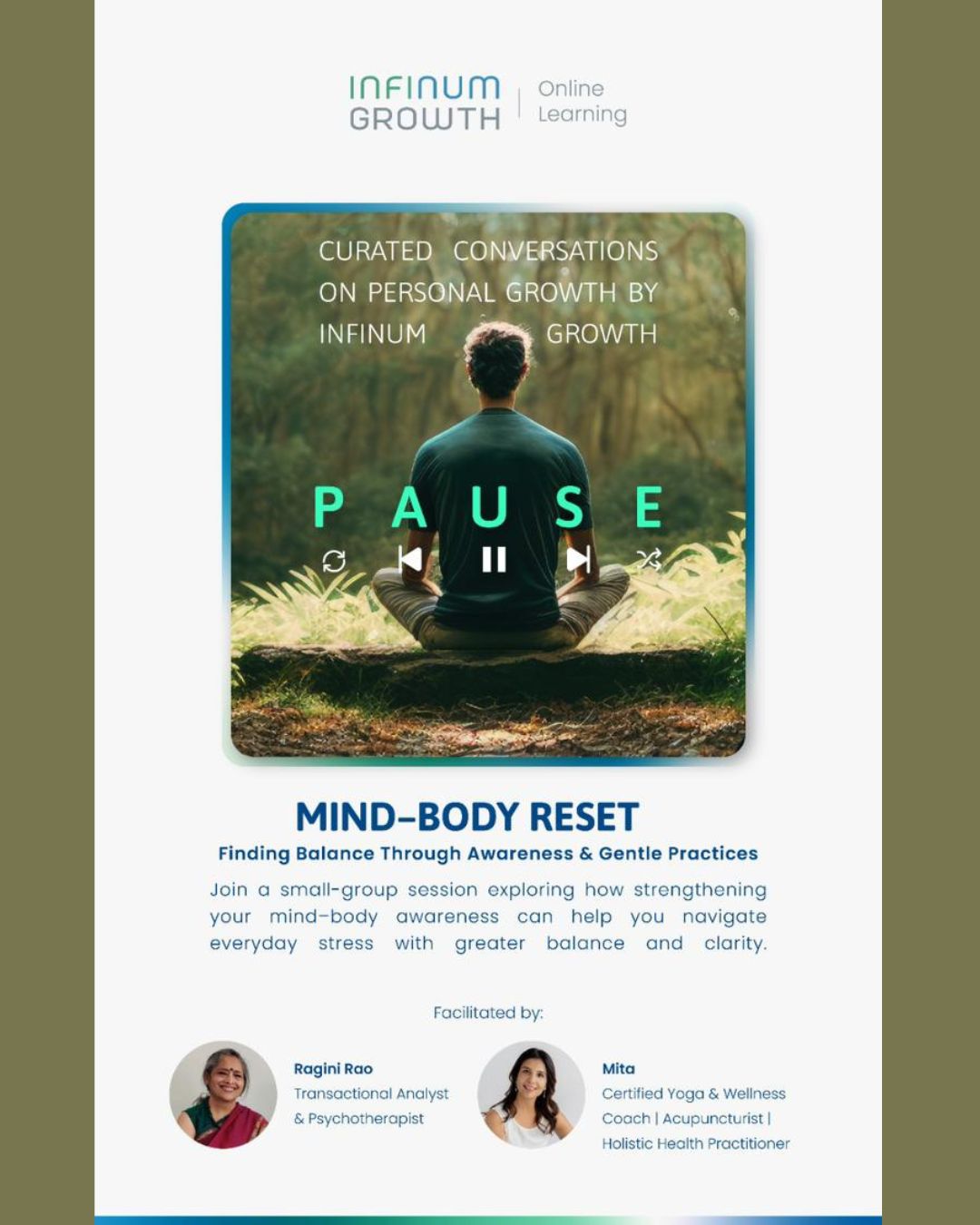The very first edition of PAUSE – A Curated Conversation on Personal Growth by InfinumGrowth, brings you The Mind Body Reset – an intimate, guided session that gently explores the connection between our thoughts, emotions, and the body.
